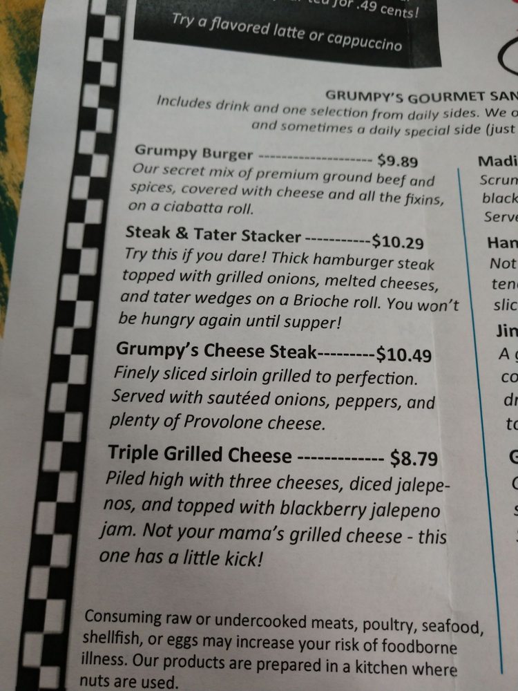 The restaurant also sells t-shirts, jams, and sauces, adding to the charm of the place. Despite a small issue with a barking dog, the overall experience at Grumpy's Diner is delightful. With great service, a welcoming environment, and tasty food, this spot is a must-visit in town. Whether you're stopping by for breakfast or just craving a sweet treat, Grumpy's Diner has something for everyone.